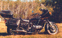 That's my GoldWing -- an '81 GL1100 Standard with Vetter fairing, lowers, and bags. It was purchased in the summer of 1994 with about 80,000 miles on the odometer and a vicious grating rattle in the engine. I figured the engine rebuild would make a cool winter project.
